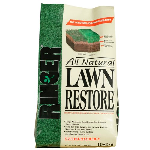 40 LB, Covers 5,000 SQFT, Ringer Lawn Restore, All Natural Lawn Fertilizer, Contains A Fully Balanced Formula That Promotes Lawn Growth & Eliminates Weed Pests, Contains All Natural Ingredients In A Balanced, Slow Release Formula Delivering Nitrogen 10%, Phosphate 2% & Potassium 6%.